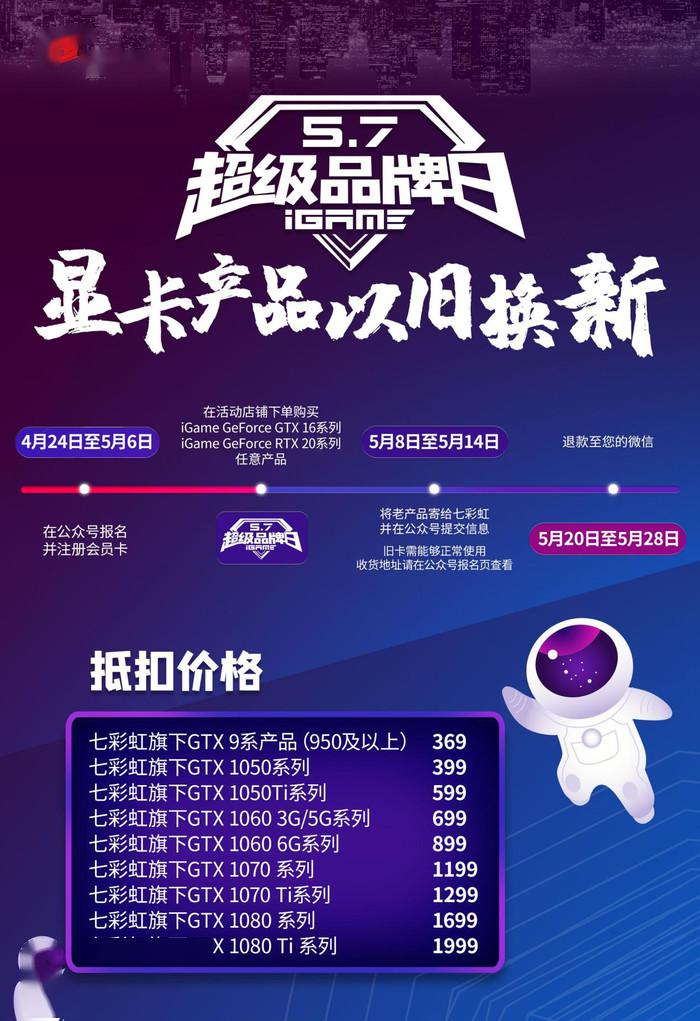 以旧换新活动也是这次品牌日的一大亮点,拥有七彩虹旗下GTX950以上显卡产品的用户,活动期间(5月7日~8日)购买iGame旗下GeForce GTX 16系列、GeForce RTX 20 系列任意产品后,均可通过iGame公众号以非常良心的价格登记回收手上的旧产品。
