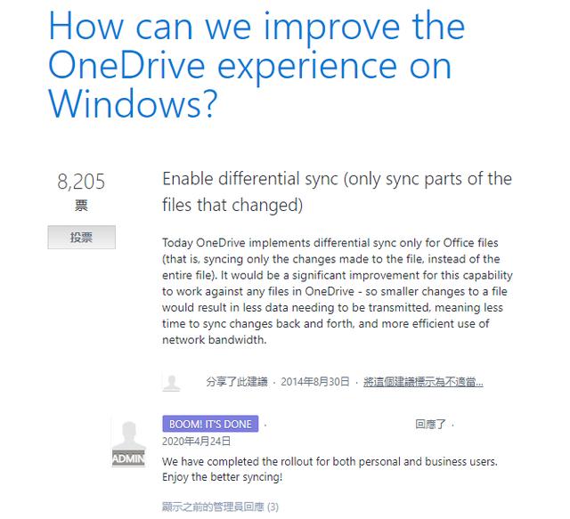 而我们从截图中可以看出直到2020年4月24日,微软官方人员才终于对该帖子进行了回复,告知该用户OneDrive网盘的个人版及商业版均已支持增量同步功能。