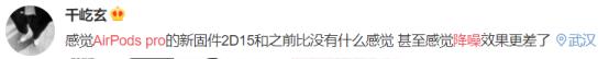 此外,苹果昨天还推出了适用于AirPods Pro的新固件,版本号由此前的2C54/2B588升级至2D15,更新内容没有说明,不少用户更新了新固件后给出了反馈。
