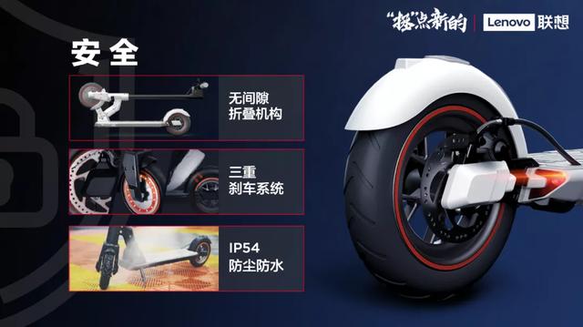 联想智能滑板车M2还具备三重刹车系统,支持碟刹、电机回转减速和脚踏刹车,满足不同用户的使用习惯。值得关注的是,联想智能滑板车M2整车拥有IP54级防尘防水能力,而电池仓、电机等核心部件更是拥有IP6X级防水能力,极大保障用户的日常使用。此外,防水能力极大的方便用户对车辆进行清洁,保持车身的洁净。