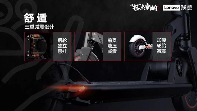联想智能滑板车M2专门打造了三重减震设计,分别是:后轮独立悬挂减震、前叉液压减震以及加厚轮胎减震。在三者协同作用下,其可以有效过滤掉路面颠簸,当用户骑行在凹凸不平的路面时,产品的独立悬挂系统会带来极具弹性的力反馈,帮助用户缓解路面冲击,骑行更畅快舒适。