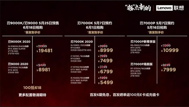 台式机产品拯救者刃9000K/刃9000电脑5月25日预售,6月1日抢购,首发到手价分别为19481元、8981元,拯救者刃7000K电脑5月7日预约6月1日抢购,首发到手价5499元起,拯救者刃7000P电脑5月7日预约5月16日抢购,首发到手价7999元起。