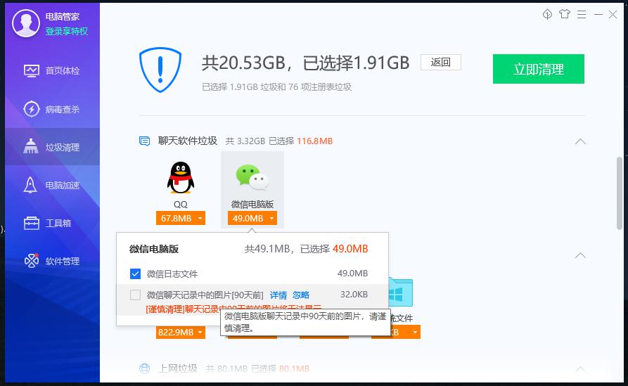 扫描完成以后,用户在列表中找到“聊天软件垃圾”这个分类,其中就可以看到QQ以及微信电脑版两个选项。在默认情况下两个选项都是被选中了的,因此用户只需要点击“立即清理”按钮就可以进行清理操作。当然用户也可以点击微信电脑板名称下的小三角按钮,在弹出的列表中勾选上要清除的选项。