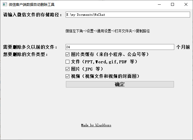 接下来在软件窗口的“请输入微信文件的存储路径:”输入框里,粘贴上刚刚复制的信息,再在“需要删除多久以前的文件:”输入框里面设置删除文件的时间节点,该工具默认的是24个月以前的文件,用户可以根据实际情况进行修改。然后在“想要删除的文件类型:”列表中,选择要删除的文件类型,其中包括图片类缓存、文件、图片、视频等等。这里建议用户将“文件”选项前的钩去除,这样可以避免在清除的时候将传递的文件也删除掉。当所有的设置完成以后,点击“确定”按钮就可以将指定的文件进行清除。