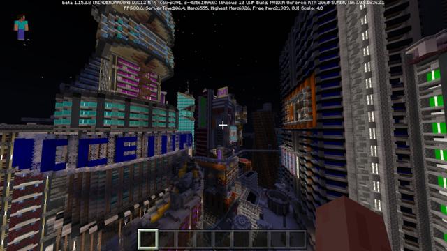 《霓虹灯区RTX》场景的风格充满了赛博朋克的味道。玩家在这个地图可以充分体验到《我的世界》画质上的下一次进化。关闭和开启RTX光线追踪,画面展现出了截然不同风格,各种灯光效果的加入,让游戏更富有创造性。