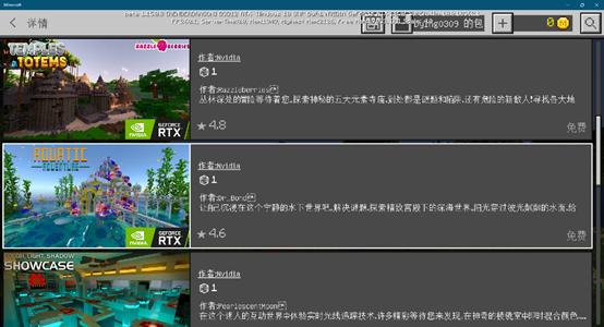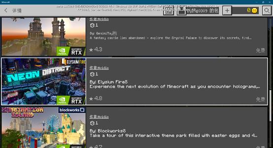 进入《我的世界》RTX Beta版本后,玩家们就可以在市场中免费下载6个具有光线追踪的地图用于体验次世代光影在这款老游戏上神奇的表现。而这6个地图也是NVIDIA联合一些知名创作者开发,完成度和体验都非常不错。它们分别是: