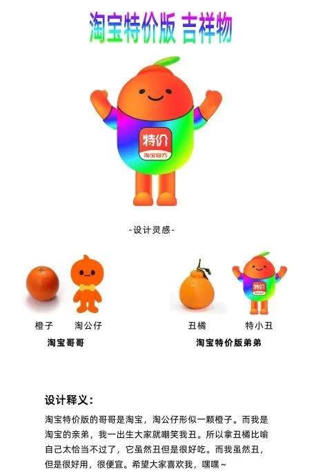 不用怀疑,这就是阿里家族的新成员,不得不说,这颜色是想亮瞎大家的眼睛吗?关于淘宝特价版吉祥物的设计理念,官方是这样解释的:因为我是橙子淘宝的亲弟弟,加上我丑,所以我是丑橘。