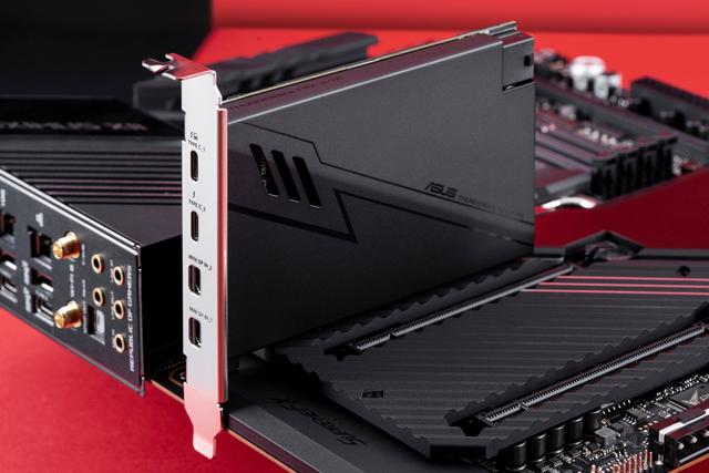 华硕ROG MAXIMUS XII EXTREME还配送了一张ThunderboltEX 3-TR扩展卡,方便玩家们使用雷电3设备。其支持40Gb/s双向传输带宽,能够支持更多高速扩展设备,带来满足更多应用场景需求。视频输出方面则支持DisplayPort1.4,可同时传输和显示8K视频。该扩展卡支持菊花链式扩展,最多能支持六个设备,足以满足大部分玩家的需求。