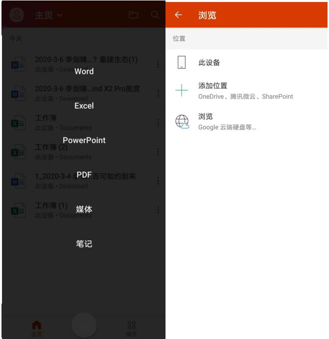微软移动版Office不仅支持打开本地文件,还可浏览谷歌云硬盘,并通过添加位置,添加OneDriver、腾讯微云、SharePoint等网络云盘,开放性还是相当不错的。而右上方的放大镜图标,则可通过关键词搜索本地的文件。