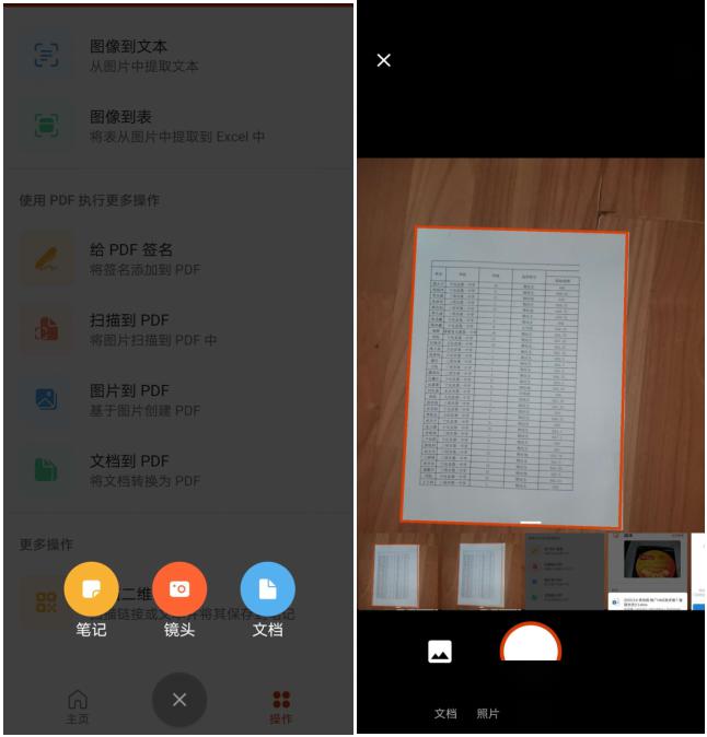 点击主页底部的+号键,除了文档之外,还有一个笔记和镜头选项。笔记选项类似于便签,方便用户快速地记录简单的文字,而镜头则便于用户拍摄照片,并迅速地生成一个PDF或Word文档,这对于快速记录或在展会等现场进行展览时,迅速生成文字有很大帮助。
