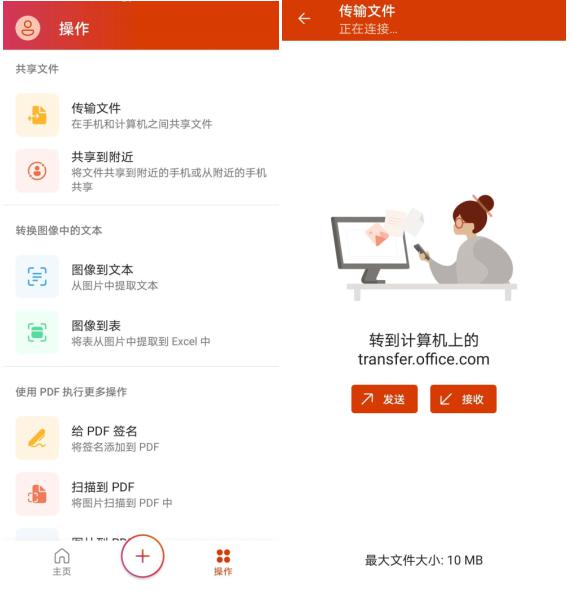 而共享到附近的操作也类似,点击后,选择发送或接收,按屏幕提示,就可以将文件发送到别的手机上。这种共享对于一对多发送和传输到其他人使用的设备上,要方便一些。而在操作中,还有转换文本、PDF操作和扫描二维码功能,也比较实用。
