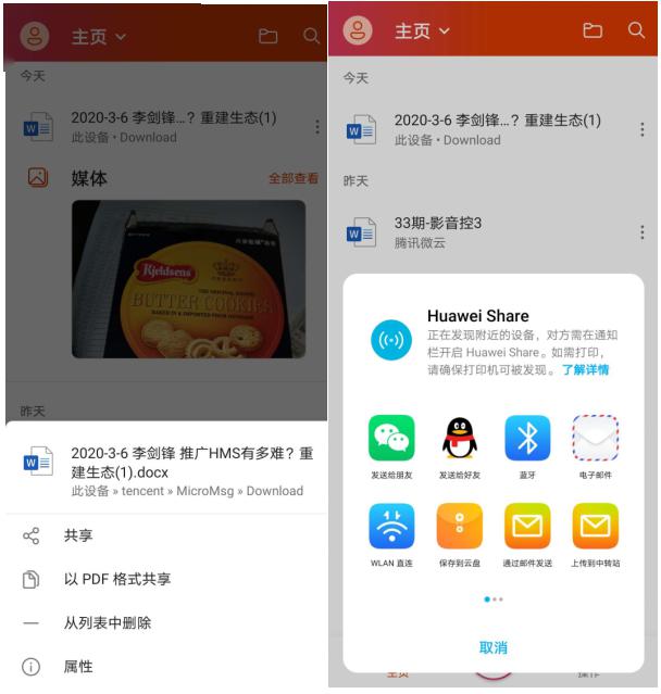 移动办公中,分享无疑是非常重要的,在前面我们已经提到,在查看文件时,可以通过底部分享键将文件分享到OneDriver上,其实微软移动Office还提供了多种分享方式。如在主页中,用户点击文件后部的三个点的标志,即可拉开菜单,可选择文件分享或以PDF格式分享,在选择之后微软移动Office会调用手机的分享功能,无论是传QQ/微信,还是发信箱、打印、上传云空间都非常方便。