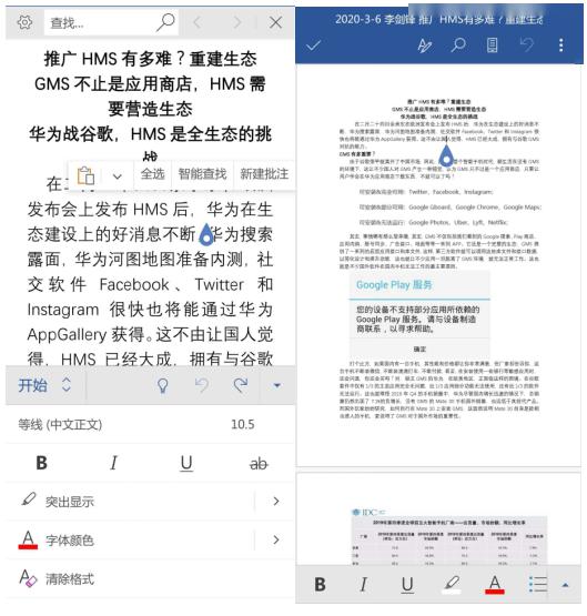 在文件查看模式中,点击右上角的笔形标志,即可切入编辑模式。在编辑区中,顶部是可隐藏的菜单区,中间是预览区,而底部是菜单区,而在预览区中长按,则相当于鼠标右键,其整体编辑功能相当完善,在操作上与桌面版的Office基本相同,对于熟悉电脑操作的人来说,可以很快上手。