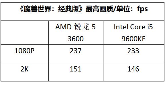 《魔兽世界:经典版》采用了传统的游戏引擎,因此对于处理器本身的单核效率以及内存频率更为敏感,而这正好是AMD锐龙5 3600的优势,7nm Zen2架构更高的IPC、更大的缓存和对高频内存的支持,让它在这款经典游戏中的帧速超过了Intel Core i5 9600KF。