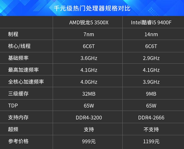 AMD第三代锐龙处理器一度横扫各个价位的处理器市场,让竞品Intel的日子非常难过。而在千元级价位,AMD锐龙5 3500X和Intel Core i5 9400F也开始了正面硬刚。由于第三代锐龙大幅提升了单核心性能,所以尽管与Core i5 9400F同为6核心6线程的配置,锐龙5 3500X在同频的情况下将会拥有更高的执行效率,而且很关键的是锐龙5 3500X的最高加速频率与Core i5 9400F相同,而基础频率甚至还高出700MHz之多,这就意味着单从硬件规格来看,就已经可以推断出锐龙5 3500X的理论性能会比Core i5 9400F强了。