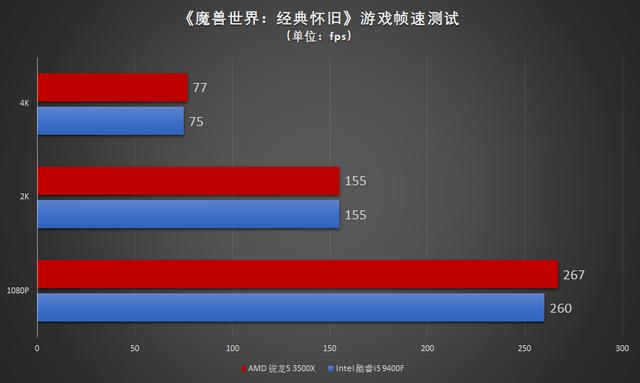 在《魔兽世界:经典怀旧》的游戏帧速测试中,我们可以看到帧速表现相比《魔兽世界:争霸艾泽拉斯》有了反转,在怀旧服中,AMD 锐龙5 3500X在帧速上小胜Intel 酷睿i5 9400F,不过除了在1080P分辨率两者的帧速差距相对大一点之外,2K和4K分辨率下两者的表现依旧还是只能用势均力敌来形容,对于玩家们来说,这样微弱的帧速差距对游戏体验上不会有什么区别。