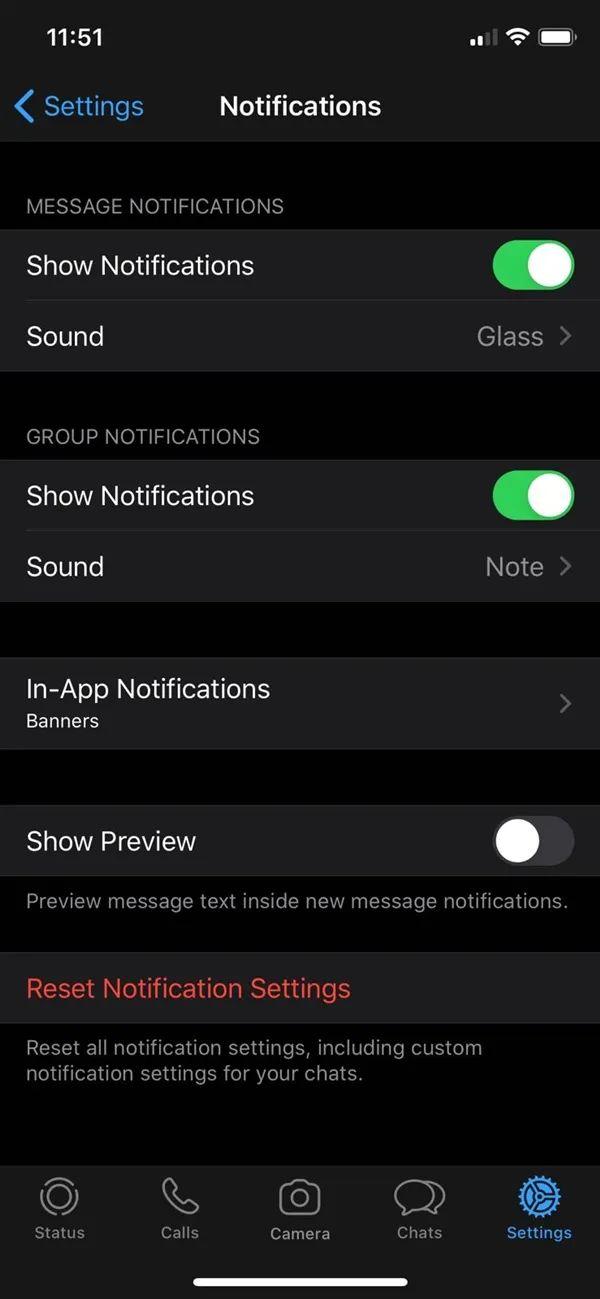 这一办法虽然没那么全局,但至少可以不误伤正常的推送通知。目前高危的APP包括微信、iMessage、Whatsapp、邮件、短信等,具体的关闭方法是在APP内设置,比如下图的Whatsapp。