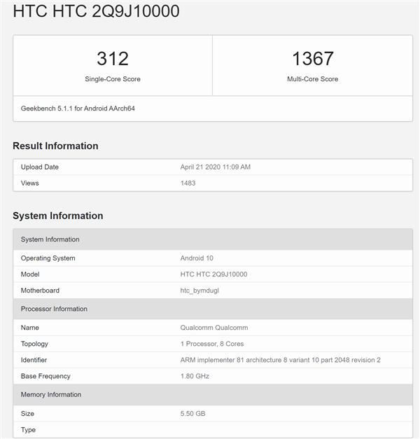 4 月 26 日, @LlabTooFeR 在推特透露,HTC 并未放弃手机业务,他们正在开发新机 HTC Desire 20 Pro。据悉,HTC Desire 20 Pro 设计像是一加 8 和小米 10 的结合体,该机正面神似一加 8,背部神似小米 10。与此同时,型号为“HTC 2Q9J10000”的神秘新机现身 GeekBench 跑分网站,使用的是高通骁龙移动平台,定位中端。 (AppSo)