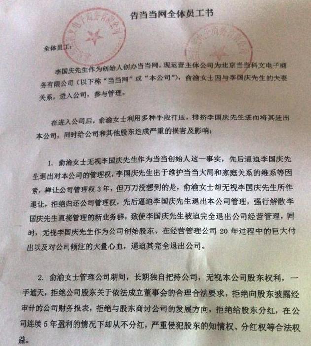 继当当李国庆、俞渝上演“八王议政”、“当众摔杯”、“浴池梅毒”、“朋友圈开撕”等诸多剧情后,4月26日,李国庆又率4条大汉上门抢当当公章,并在公司张贴《告当当网全体员工书》,称公司依法召开临时董事会,“罢免”俞渝,自己当选董事长与总经理,全面接管公司。