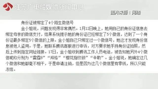 浙江宁波的金女士,想用自己的身份证信息去绑定母亲的微信支付,结果系统提示她的身份证已经绑定了5个微信,除了自己的微信账号之外,其余4个陌生的微信昵称,分别为"雷霆8""拜格""樱花指纹锁""辛勒"。在该用户申请注销后却被告知,因为这几个微信里有零钱,所以只能冻结。