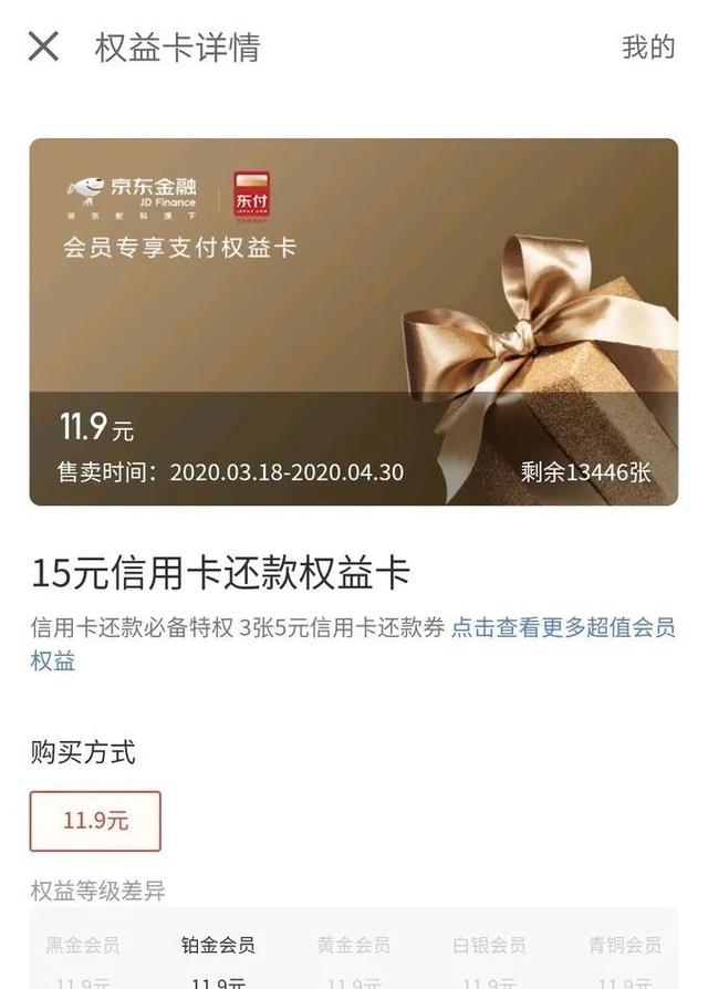 即日起至4月30日。符合条件的用户可11.9元购15元信用卡还款权益卡,其中满1000减5元信用卡还款劵1张,满3000减5元信用卡还款劵2张。