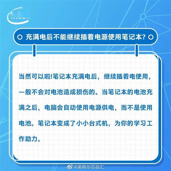 不知道大家有没有发现,笔记本跟手机的使用情况很相似,越用越慢的同时,电池总是最经不起折腾的零部件。有很多人都疑惑,笔记本到底要不要插电工作或者是充满之后要不要继续充电使用?充电时间太长或者次数太多会不会影响电池寿命?近日,英特尔官方微博给出了答案:笔记本电池充满电之后完全可以继续插着电源使用笔记本。