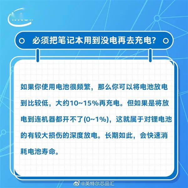 英特尔官方科普提到:当笔记本电池充满电之后,电脑会自动使用电源进行供电,而不是使用电池。当你使用电池很频繁,你可以将电池放电到比较低,大约10%-15%再充电。但如果是将放电到连机器都开不了(0-1%),这就会对锂电池造成较大的损伤(属于深度放电),长此以往会快速消耗电池寿命。