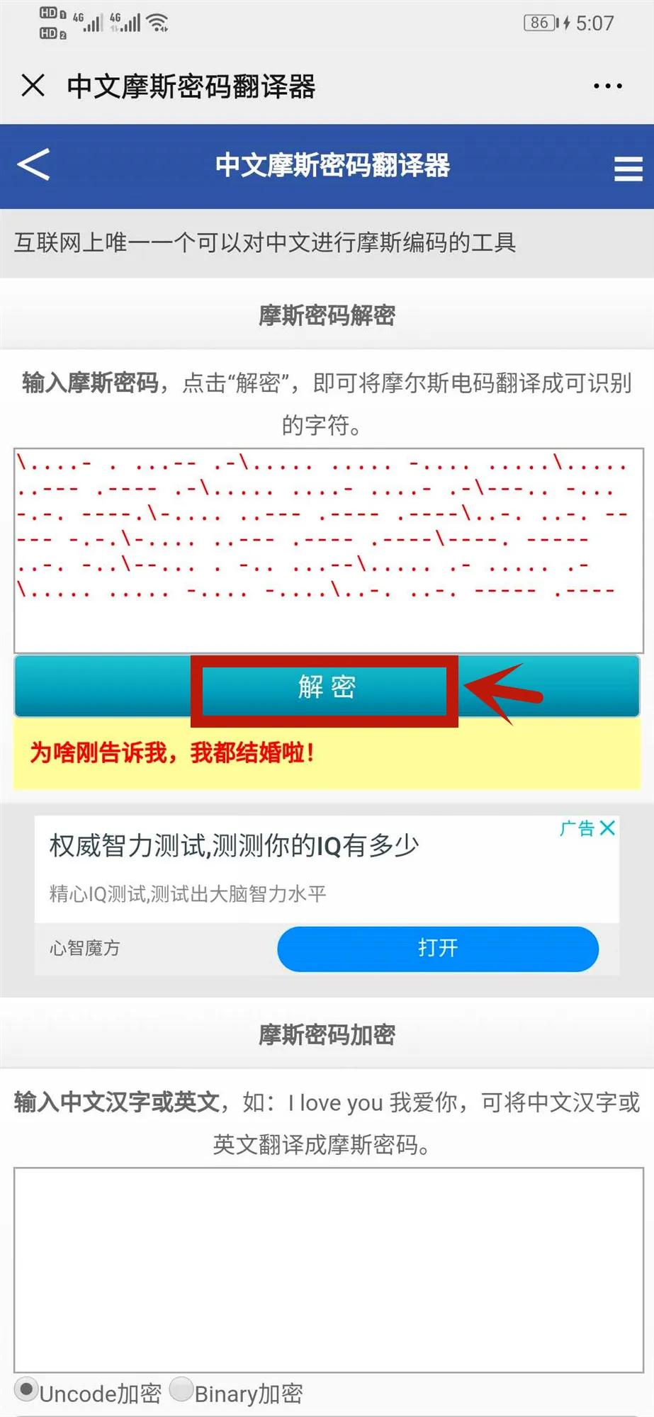 打开之后我们在下方的输入框输入想说的话,点击转为莫尔斯密码,然后上方就出现了转化后的结果,我们复制发给好友即可。