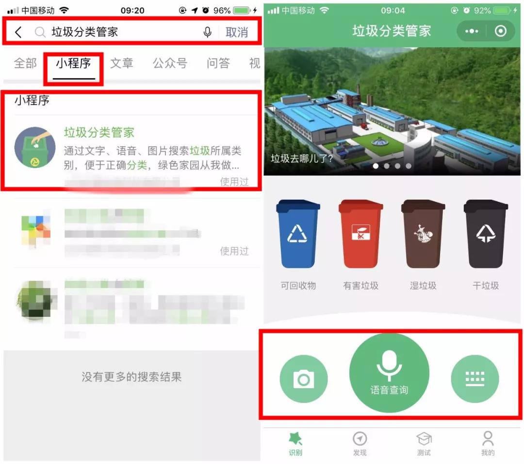 1、打开微信,直接在小程序里搜索“垃圾分类”,就会看到很多小程序了,我这里选择了一个带有拍照查询、语音查询和直接文字搜索查询功能的,可以说是非常方便了。(如图)