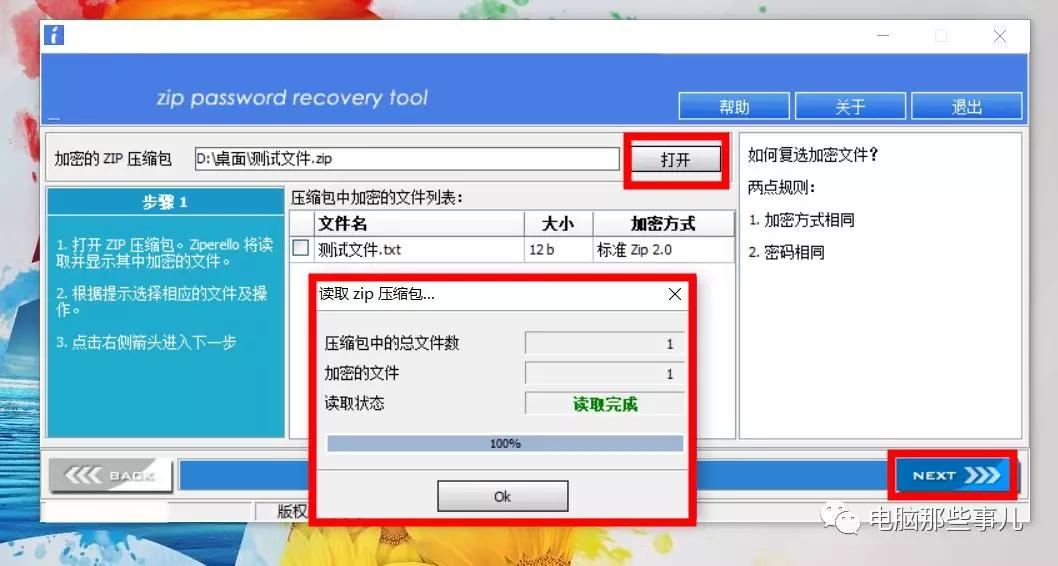 3、 点击“打开”,添加需要破除密码的压缩包。 工具会自动分析出文件的加密情况。