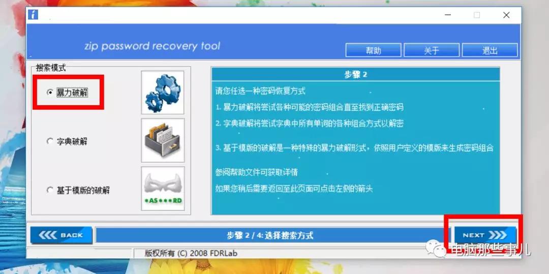 4、选中压缩包点击next,选择破除方式,有暴li、字典和基于模板等。(我这里直接选择了第一个)然后点击next。