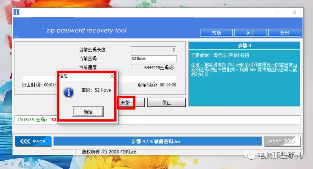 6、最后点击“开始”,即可进行密码破除。破除过程中可以随时点击停止,返回去重新设置破除设定。(效果如下)