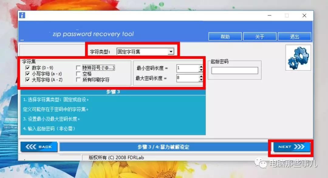 5、接下来选择密码可能包含的字符集,比如数字、大小写字母等,还可以设置预估的密码长度,可以限制最短和最长。接着点击next。