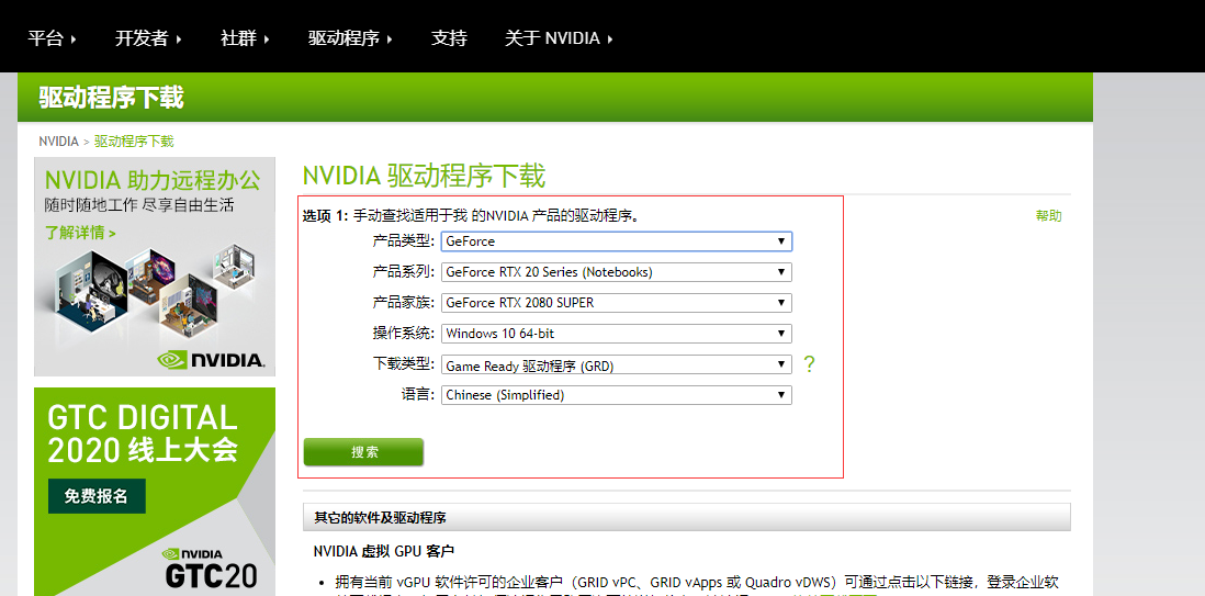 4.在这里选择自己的显卡型号,然后点击"搜索",即可下载显卡驱动啦,一般都是一键安装的