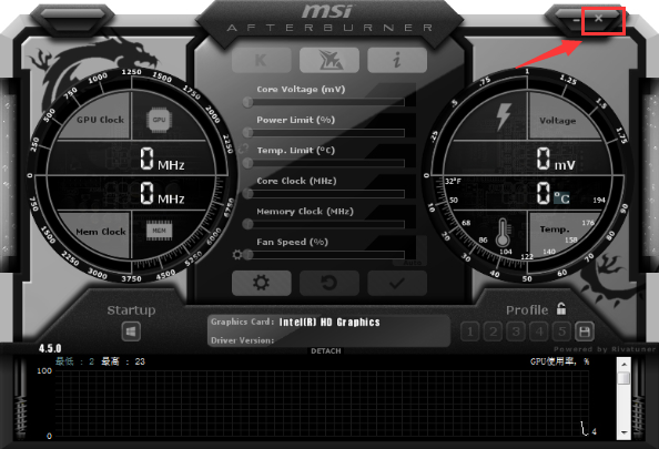2,点击右上角的叉叉按钮就可以关闭msi afterburner微星超频软件了。