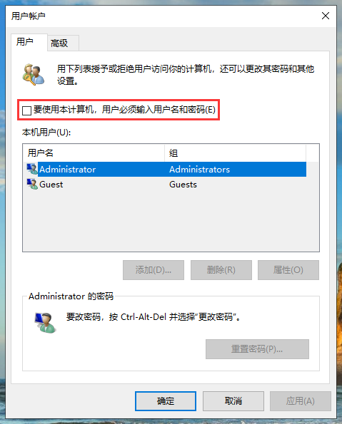 2、取消“要使用本计算机,用户必须输入用户名和密码”选项的勾选,点击“确定”即可。