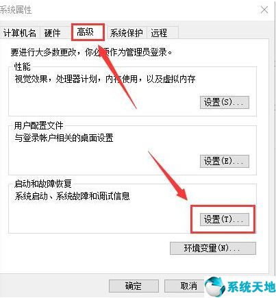 2.在出现的系统属性,点击 高级 之后点击启动和故障恢复的设置