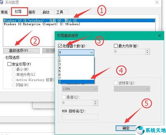 6.然后点击“引导”,切换后,选择你的系统,小编的是双系统所以有两个,点击如图所示的“高级选项”,在弹出的界面勾上“处理器个数”,点击下拉箭头,选择最大的数字,然后点击确定即可。
