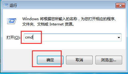 1、 首先我们同时按下键盘上组合键“Win+R”打开运行窗口,在运行窗口中输入“cmd”命令并确定;或者在桌面点击“开始”,在附件找到“命令提示符”并点击打开