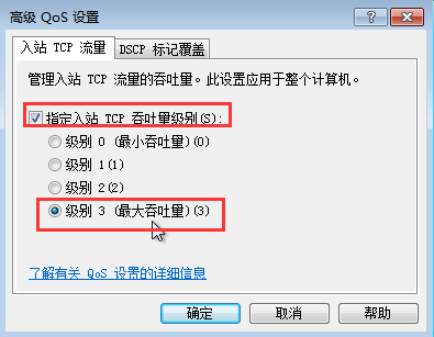 6、在“选择入站TCP吞吐级别”前打勾,然后选择“级别3”按钮