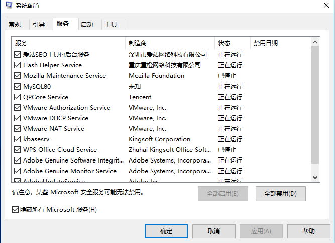 2、进入系统配置,切换到服务选项卡,这时所有随系统启动的加载服务都会列表显示