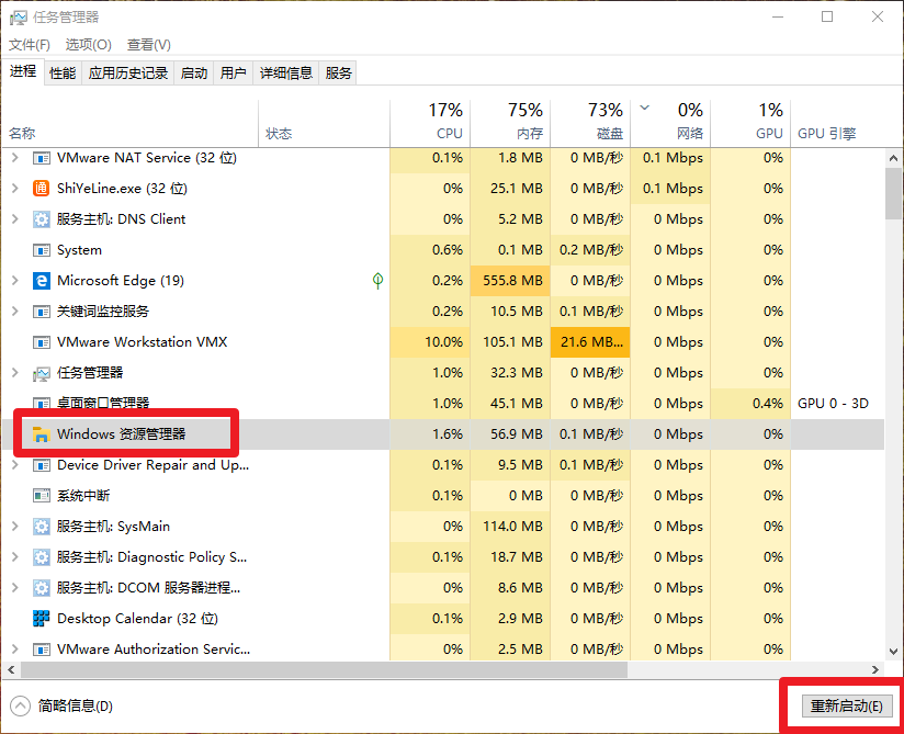 2、然后,在进程下面找到“Windows资源管理器”,右键“重新启动”;