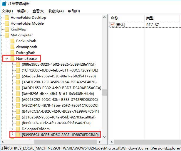 【HKEY_LOCAL_MACHINE\SOFTWARE\Microsoft\Windows\CurrentVersion\Explorer\MyComputer\NameSpace】,新建项,命名为【{5399E694-6CE5-4D6C-8FCE-1D8870FDCBA0}】