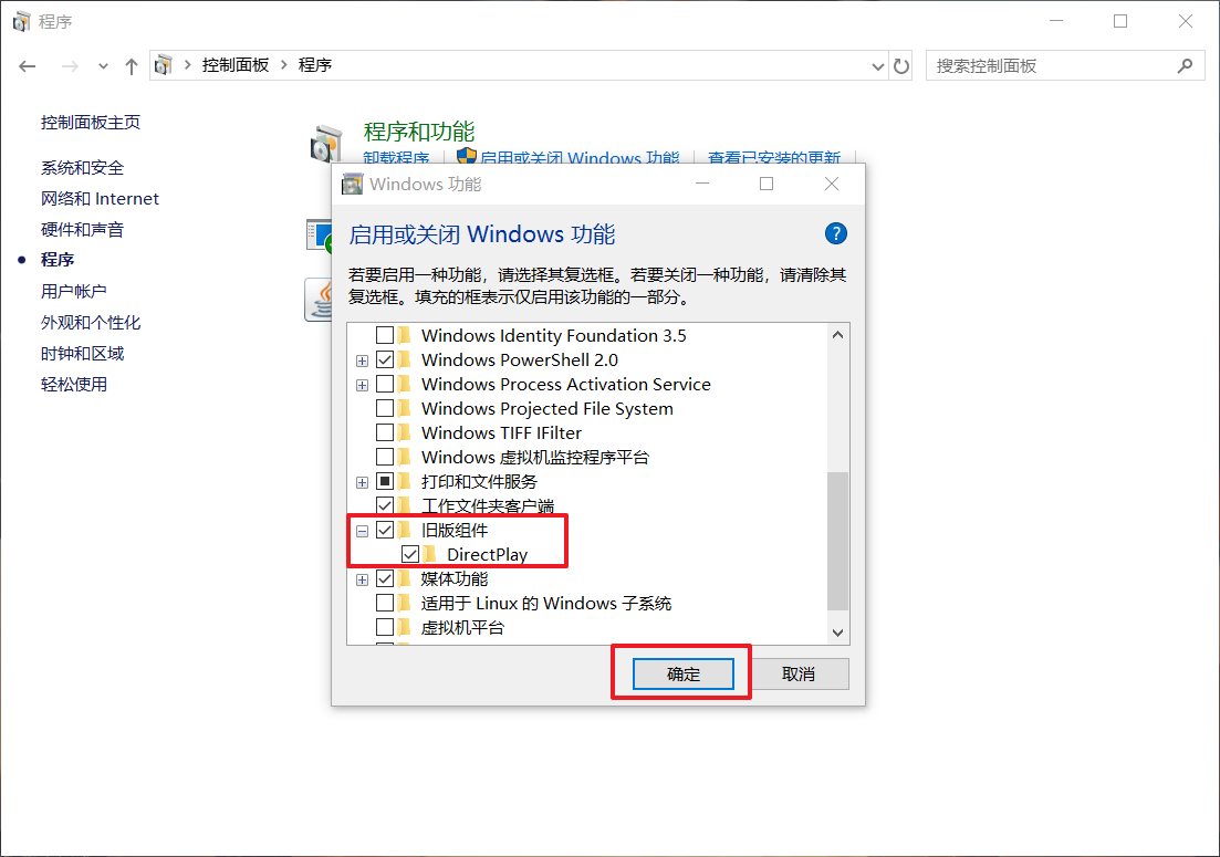 4、 然后,在打开的Windows功能设置中,找到并展开“旧版组件”,勾选“DirectPlay”功能,点击下方的“确定”