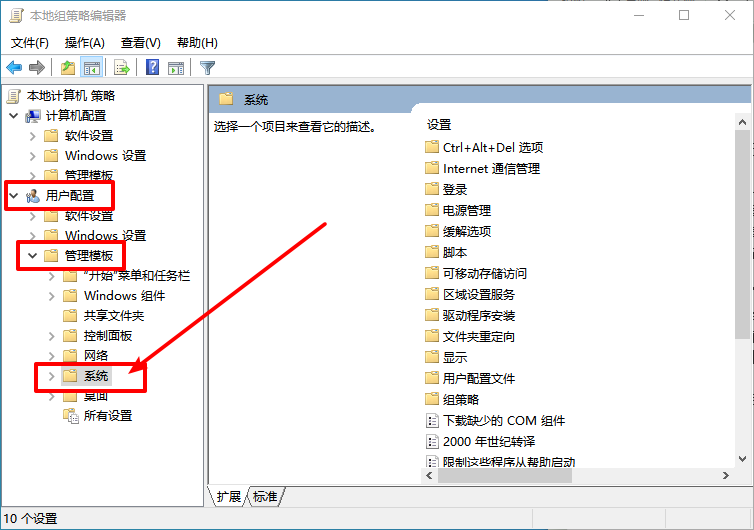 2、在本地组策略编辑器中,在左侧窗格中依次展开“用户配置-管理模版-系统”