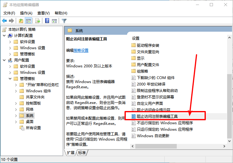 3、接着,在右侧窗口找到“阻止访问注册表编辑工具”,鼠标左键双击打开