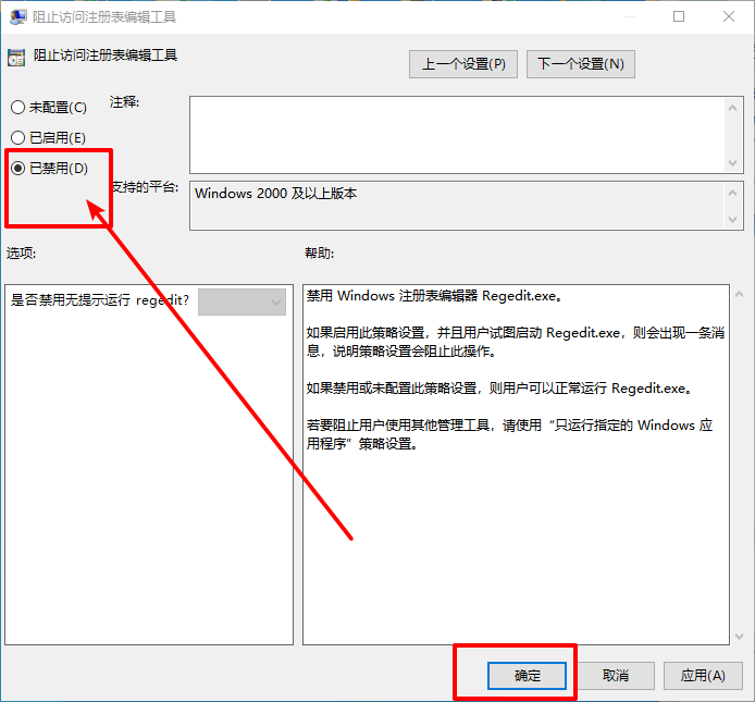 4、最后,将“阻止访问注册表编辑工具”设置为“已禁用”,再点击“确定”即可