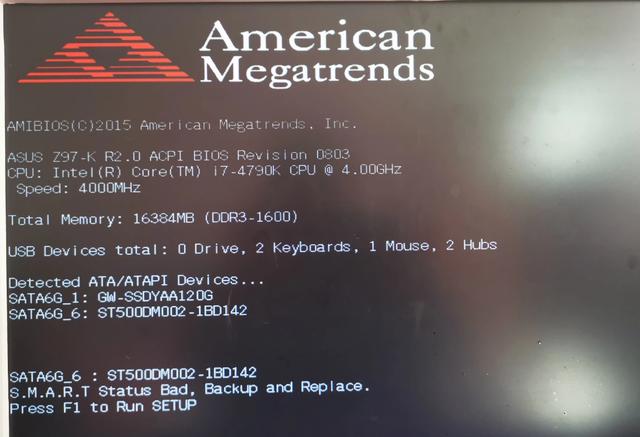 第一句指出问题出在500G的希捷硬盘上,SMART是检测磁盘错误的技术,第二句意思是指“SMART报告硬盘状态差,需要备份并更换”。所以,导致开机不进系统,反而进入AMI报错界面的罪魁祸首就是这个500GB的硬盘。