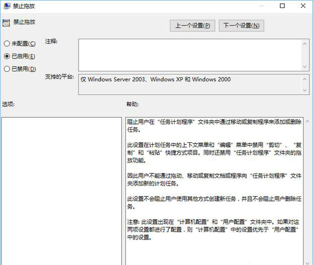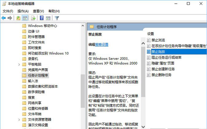 2、然后,依次展开“用户配置”项目下方的“管理模板”在展开 “Windows组件”中,单击“任务计划程序”,然后在右边窗口中找到“禁用拖放”