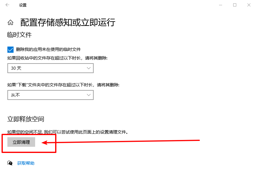3、打开之后,点击下方的“配置存储感知或立即运行”